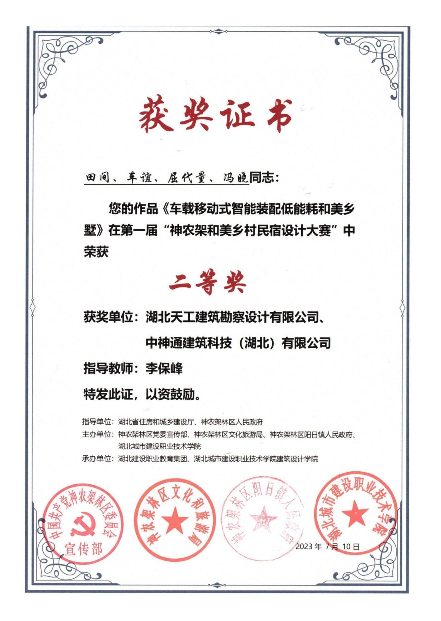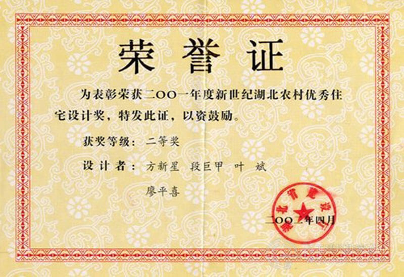 “二〇〇一年度新世紀(jì)湖北農(nóng)村優(yōu)秀住宅設(shè)計(jì)獎(jiǎng)”榮譽(yù)證