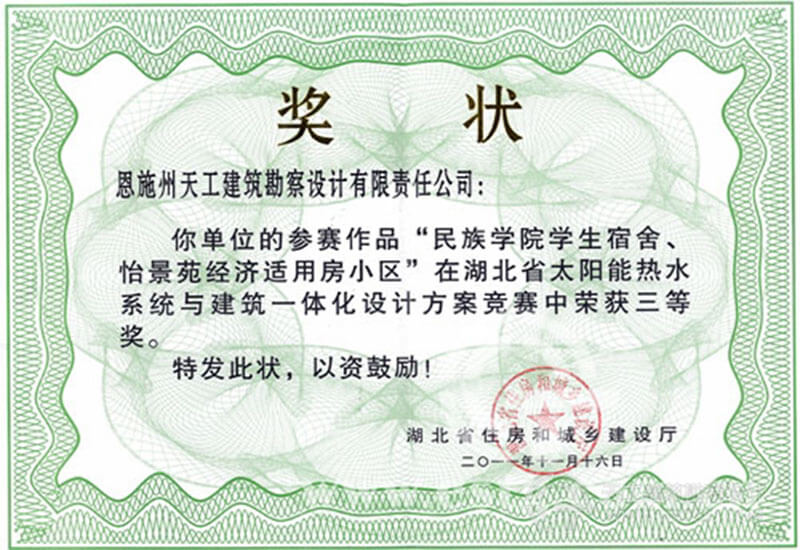 湖北省太陽能熱水系統(tǒng)與建筑一體化設(shè)計(jì)方案競賽獎(jiǎng)狀
