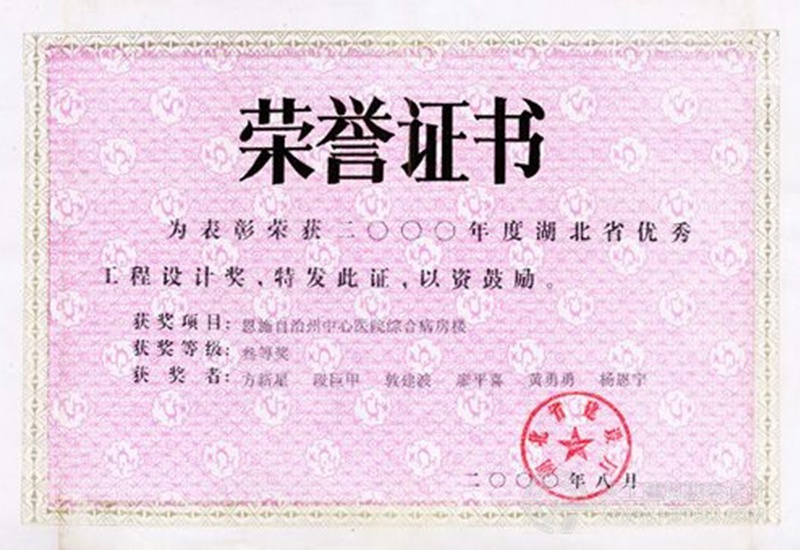 “二〇〇〇年度湖北省優(yōu)秀工程設(shè)計(jì)獎(jiǎng)”榮譽(yù)證書