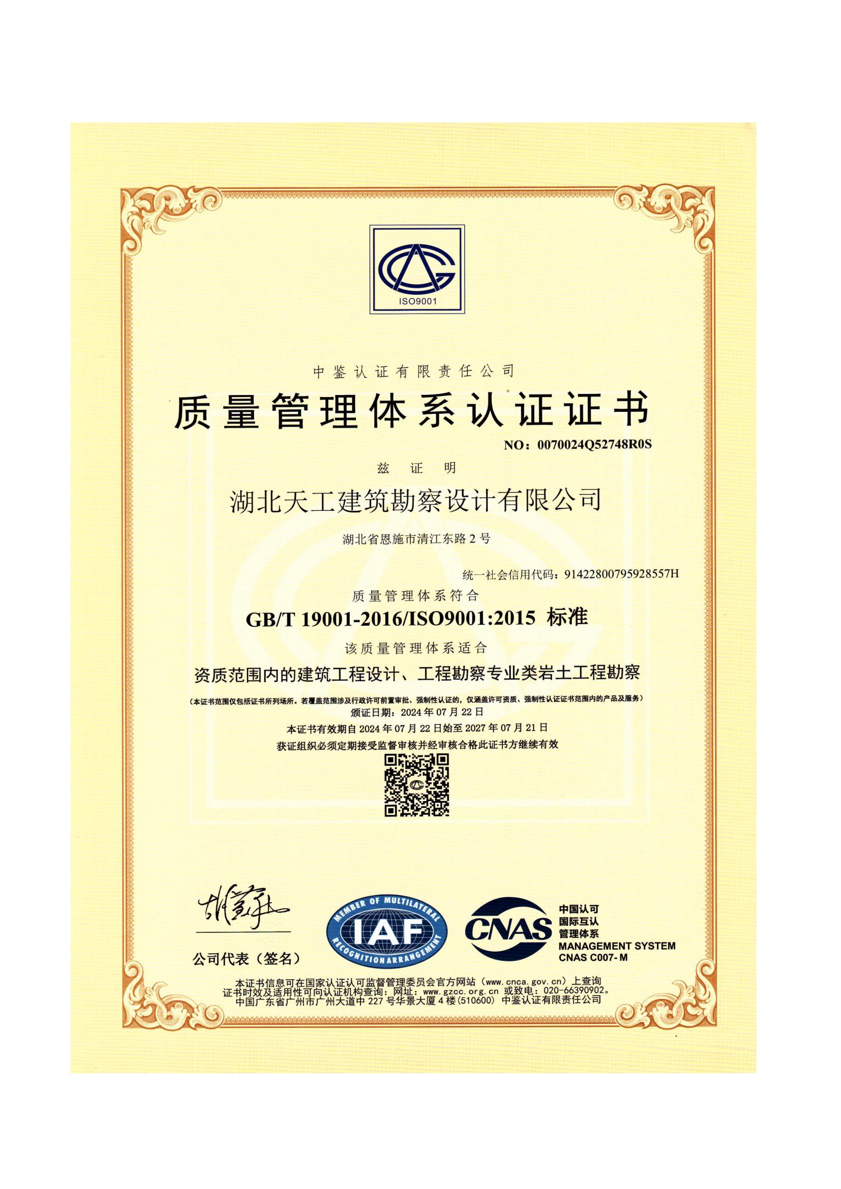 質(zhì)量管理體系認(rèn)證證書