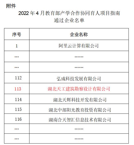教育部產學合作協同育人項目專家組于2022年5月11日發布教產專〔2022〕3 號文《關于公布教育部產學合作協同育人項目指南通過企業名單(2022 年 4 月)的通知》中,序號113(詳后截圖),湖北天工建筑勘察設計有限公司榮譽上榜。